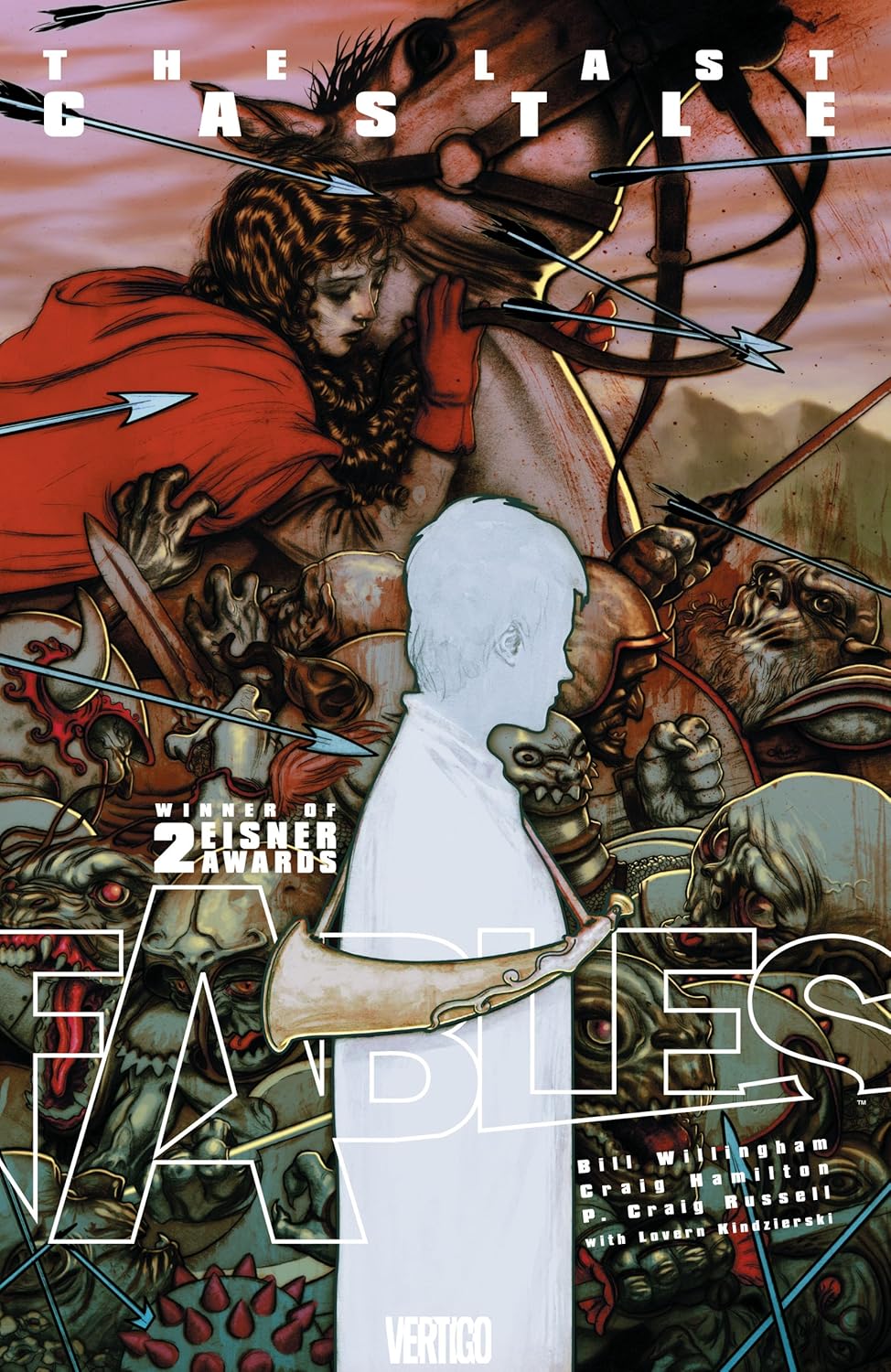 Fables: The Last Castle by Bill Willingham, Craig Hamilton, P. Craig Russell (Vertigo, 2003) This prequel to Bill Willingham's excellent Fables series takes readers back to the time before the last of the surviving fairy-tale characters fled the Homelands for New York City. In The Last Castle, the boundless armies of the Adversary have found the final stronghold and are determined to destroy every last one of the survivors huddled within. Told through the eyes of Boy Blue, this brief tale describes the heroic last acts of many well-known storybook characters and the general high spirits with which they met their end. Although hopeless, they know every second they can delay their foes gives the last boatload of refugees more time to escape the Homelands for a friendlier clime. More personally poignant is Blue's story of romance with Red Riding Hood, now all grown up, who arrives at the stronghold just moments ahead of the enemy troops. Her story here, entwined with his, ends with the perfect cruel twist so prevalent in classic tales. And, for fans of the ongoing series, this prequel fills in some noteworthy gaps in our knowledge. Illustrations by penciller Craig Hamilton and inker/layour artist P. Craig Russell are not as finely wrought as we've come to expect from Willingham's usual artist, Mark Buckhingham, but they tell the story in a pleasant storybook fashion. All in all, The Last Castle is a valuable addition to the Fables canon. (Note for anyone collecting the full series of collected Fables stories: Although The Last Castle is a solid story and should definitely be part of your library, the stand-alone book was later included as part of the fourth collection March of the Wooden Soldiers.)